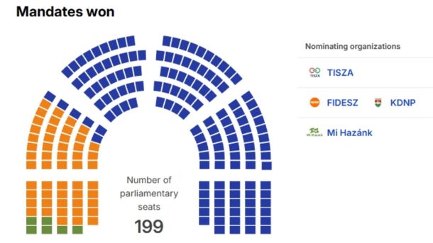 With all votes cast in the April 12 general election counted, the Tisza Party will have 141 representatives in Hungary's 199-seat parliament, giving the party a comfortable two-thirds majority with 70.85%, data from the National Election Office released late Saturday show. The Fidesz-KDNP alliance will have 52 representatives (26.13%) and Our Homeland ('Mi Hazánk') six […]