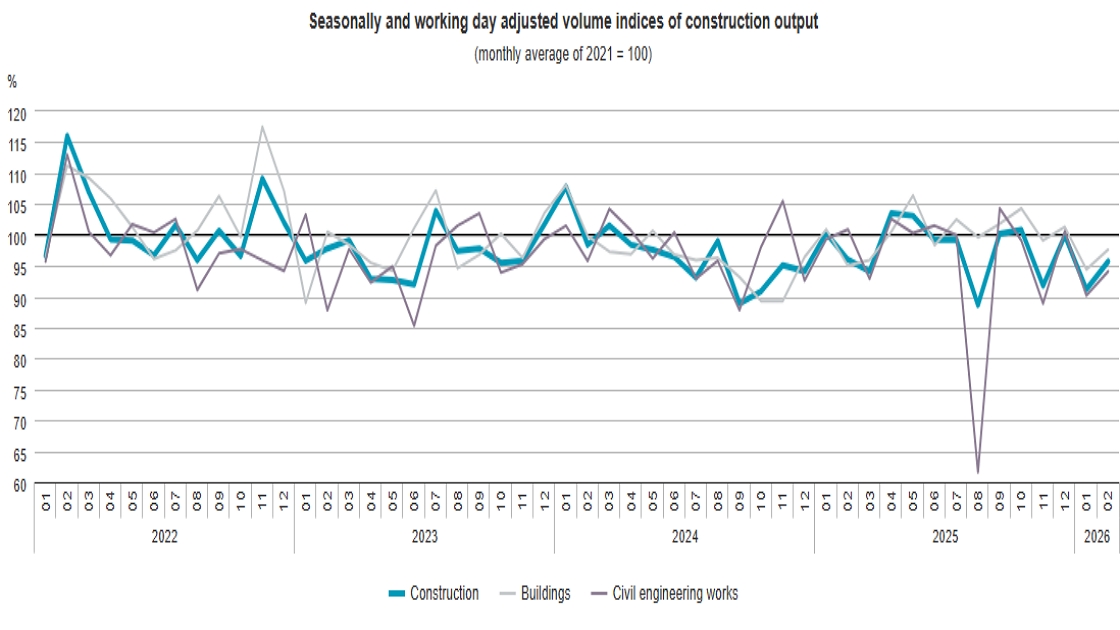In February 2026 compared to the same month of the previous year, output of the two main groups of construction changed in opposite directions: the construction of buildings rose by 2.2%, civil engineering lessened by 6.3%. Two opposite processes are in the background of the latter: while output of the road and railway construction group increased by 37.6% that of utility projects fell by 41.6%.