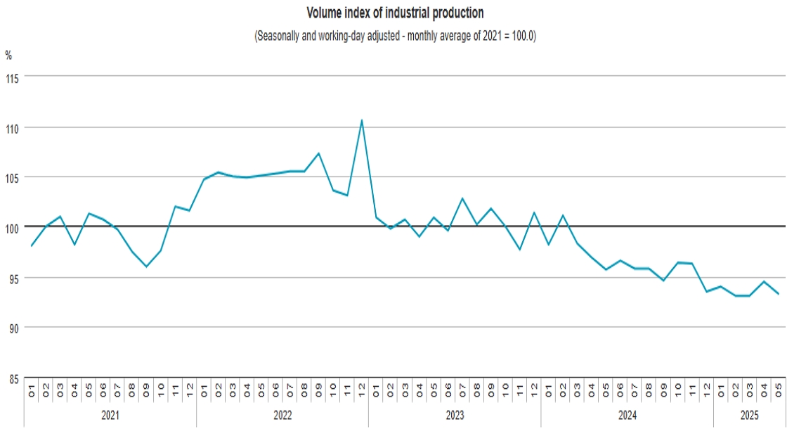 Industrial output in May – according to seasonally and working-day adjusted indices – was 1.3% below the level of the previous month.