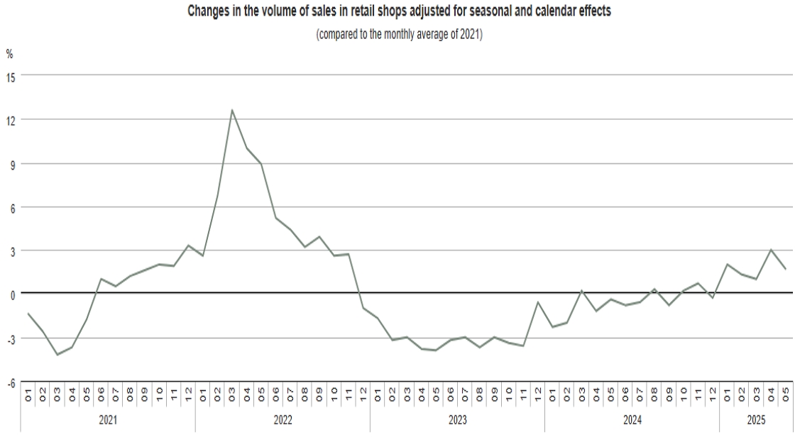 Compared to the same period of the previous year, calendar-adjusted sale volumes expanded by 0.5% in specialized and non-specialized food shops, by 4.0% in non-food retailing and fell by 1.1% in automotive fuel retailing. According to seasonally and calendar adjusted data, the volume of retail sales was 1.3% down on the previous month. In January–May 2025, the volume of sales – also according to calendar adjusted data – was 3.1% higher than in the corresponding period of the previous year.